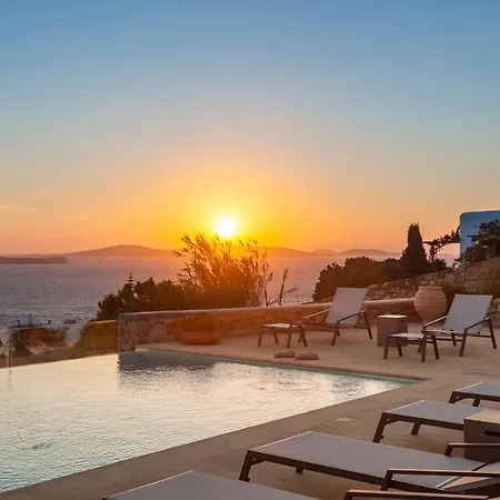 A tengerre néző terasszal rendelkező 10 hálószobás Newly Built Spectacular Sunset Villa At St. John, Mykonos Agios Ioannis Diakoftis 10 perces autóútra fekszik a Mikonosz repülőtértől.